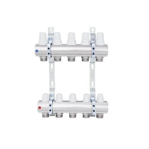 Колектор ICMA Арт. K005 з запірними кранами з мікрометричним регулюванням призначений для розподілу теплової енергії в системі опалення. Дана установка застосовується в системах радіаторного опалення. Регулювання витрати мережної води по контурах - ручна або терморегулююча. Запірні крани з мікрометричним регулюванням дозволяють перекривати подачу води і регулювати витрату мережної води в кожному контурі опалення. Колектор має 5 виходів.