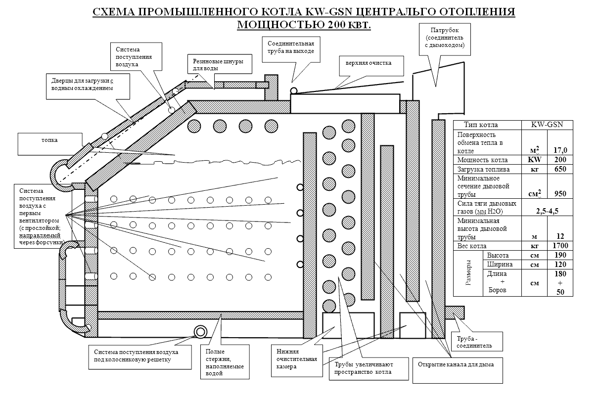 Твердотопливный котёл Идмар KW-GSN 200 кВт изготовлен из высококачественной листовой стали и цельнотянутых бесшовных толстостенных труб. При изготовлении применяется жаропрочная листовая сталь которая предназначена для высоких температурных перепадов. Твердотопливные котлы длительного горения Идмар KW-GSN имеют высокотехнологичную конструкцию. Стенки корпуса котла - целостные стальные элементы без пайки. Такая технология (т.е. отсутствие щелей и прорезов) значительно увеличивает прочность и долговечность работы котла. Толщина стали от 6 до 12 мм в зависимости от мощности котла. Промышленные твердотопливные котлы Идмар KW-GSN имеют достаточно высокий КПД - 89%, в отличие от других твердотопливных котлов (порядка 80%). Гарантия на твердотопливные котлы Идмар KW-GSN дается на 2 года. Угроза аварий в течение года остается на уровне 0,5 %. Рабочее давление в котлах Идмар KW-GSN составляет до 2,5 Бар. Это даёт возможность работы котлов в закрытых системах под давлением.