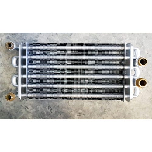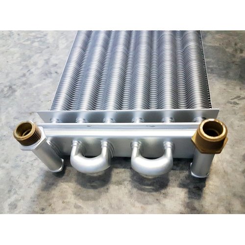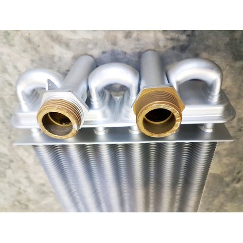 Теплообменник битермический ECA Calora BUDERUS DELTA 295 мм, резьбовое подсоединение штуцеров по отоплению, диаметром 3/4 дюйм, и штуцеров на горячее водоснабжение диаметром 1/2 дюймовый.