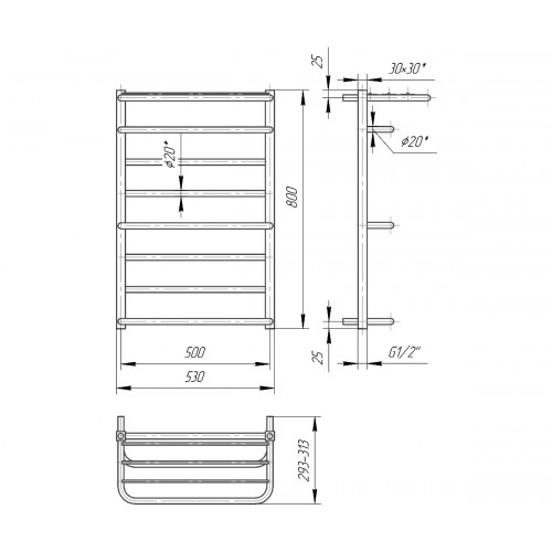 Водяной полотенцесушитель Люксор 800х500 с межосевым растоянием для подключения 500мм, диметр подключения G 1/2'' состоит из 8 ребер. Полотенцесушитель Люксор производсветнного предприятия Mario изготовлен из нержавеющей стали АІSI 304 может быть оборудован электрическим теном.