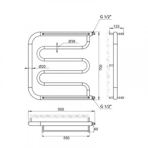 Полотенцесушитель водяной Змеевик D 38/20х1/2" 50х70 с полотенцедержателем