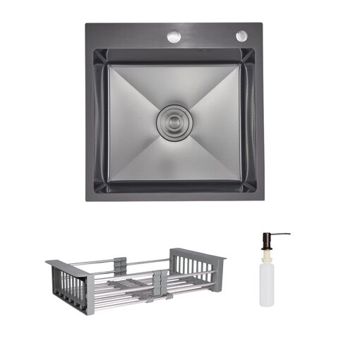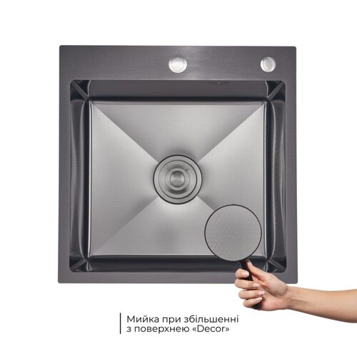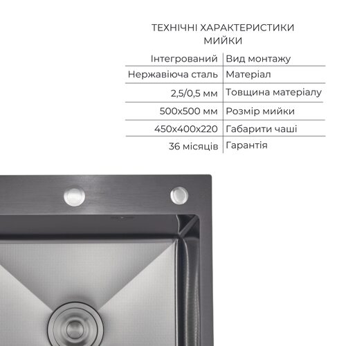 Інтегрована мийка з нержавіючої сталі з покриттям Black PVD та візерунком Honeycomb. У комплекті — дозатор і кошик Lidz K01G, що додають функціональності та завершеності робочій зоні.