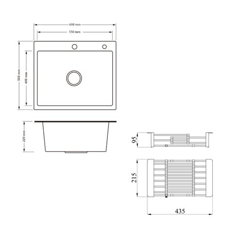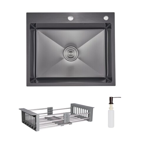 Інтегрована мийка з нержавіючої сталі з ефектним чорним покриттям Black PVD і рельєфним малюнком Honeycomb. У наборі — дозатор і кошик Lidz K01G для повного комплекту кухонного оснащення.