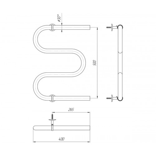 Водяной полотенцесушитель Змейка ∅30 500х400 с межосевым растоянием для подключения 500мм, диметр подключения G 1/2'' 3 гиба. Полотенцесушитель Змейка 30 с боковым подключением производиться на нашем предприятии Марио с 1998 года.