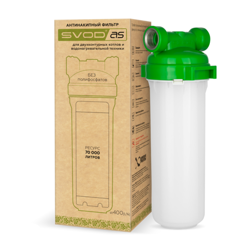 Антинакипный фильтр для двухконтурных котлов и водонагревательной техники со сменным картриджем "SVOD-AS" (подключение - латунная резьба). Наполнитель "SVOD-AS" давно зарекомендовал себя, как надежная защита, не имеющая аналогов по широте и спектру применения в обеспечении безнакипного режима работы водонагревательного оборудования. Технические характеристики: Размер 10 дюймов Ресурс фильтра - 70 000 литров (при условии что вода соответствует ГОСТу 7525:2014 "Вода питьевая") Подключение - 3/4" (латунная резьба) Температура обрабатываемой воды: +5 ... +40 °С Рабочая температура нагреваемой воды: +5 ... +105 °С ​Пропускная способность фильтра - 1,5 - 3 м3/час Максимальное давление воды - до 0,6 МПа (6 атм.) Срок эксплуатации (картриджа) - 1 год Срок годности (картриджа) - 3 года Комплектация: Корпус - 1 шт. Картридж "SVOD-AS" S400 - 1 шт. Ключ - 1 шт. ​Кронштейн - 1 шт. Паспорт и инструкция эксплуатации - 1 шт.