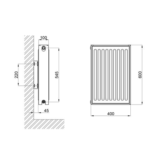 Радіатор сталевий Thermo Alliance 22 тип 600×400 мм з боковим підключенням (арт. TA22600400K) — компактний панельний радіатор з двома панелями та двома конвекторами, призначений для настінного монтажу в автономних системах опалення. Тепловіддача — 848 Вт. Радіатор витримує температуру до 95 °C і тиск до 10 бар. Виготовлений зі сталі завтовшки 1,2 мм. У комплекті — кран Маєвського, заглушка та комплект кронштейнів для настінного кріплення.