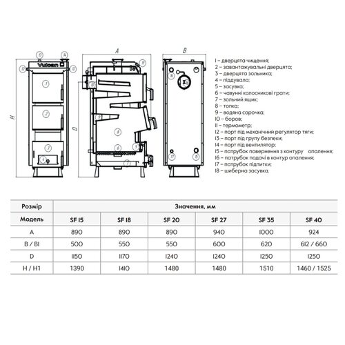 Твердопаливний котел Thermo Alliance Vulcan SF 18 працює з високим коефіцієнтом корисної дії та може забезпечити теплом приміщення площею до 180 м². Високий показник ККД досягається за рахунок чотириходового теплообмінника з великою площею. Велика камера для завантаження палива забезпечує тривале горіння. Сталевий водогрійний котельний агрегат обладнаний колосниковою решіткою з чавуну та передбачає ручне завантаження палива: дров, кам'яне вугілля, брикети. Теплоізоляція стін — мінеральна вата то