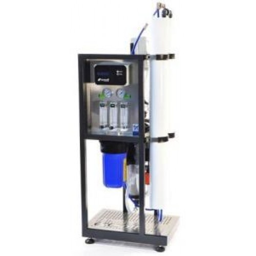 Назначение: очистка воды в загородных домах, кафе, ресторанах, лабораториях, а также в промышленности для малых технологических процессов.Система представляет собой современный компактный функционально законченный модуль, отвечающий всем требованиям эффективности, компактности и эргономичности.Принцип работы системы традиционный для обратноосмотических установок и заключается в разделении исходной воды полупроницаемой мембраной на два потока: очищенную воду — пермеат и воду с повышенным содержанием примесей — концентрат, который сбрасывается в канализацию.В системах данного типа применяется техническое решения по рециклу концентрата, что позволяет существенно снизить сброс сточных вод и увеличить выход очищенной воды. Использование высокоэффективных мембранных элементов Filmtec XLE-4040 (Dow Chemical) позволяет регулировать КПД системы по пермеату в зависимости от качества исходной воды и тем самым достигать максимального его увеличения (50-75%) без угрозы для эксплуатационных свойств мембран.Стабильная и энергоэффективная работа установки обратного осмоса Ecosoft MO обеспечивается центробежным насосом высокого давления Grundfos, характеризующимся более низким энергопотреблением.Использование современного контроллера обеспечивает полную автоматизацию работы установки. Кроме того, в базовую модель установки включен датчик электропроводности пермеата, что позволяет непрерывно контролировать качество очищенной воды.Компактное исполнение системы и специально разработанная панель подключений существенно упрощает транспортирование, монтаж и обслуживание установки. А использование пластичных соединительных трубок обеспечивает значительное снижение вибраций и уровня шума, создаваемых насосом высокого давления при эксплуатации установки.
