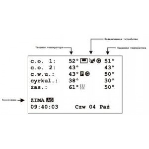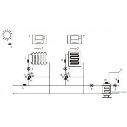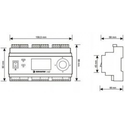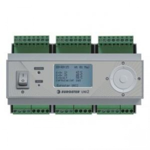Euroster UNI 2 является универсальным контроллером для обогревательной установки с:двумя контурами ц.о со смесительными клапанами (например для радиаторов отопления и полового отопления)контуром ГВСконтуром циркуляции ГВСТехнические характеристикиЭлектропитание: 230 В/ 50 ГцМаксимальное потребление мощности: 4 ВтМаксимальная нагрузка выходов: 100 Вт (каждый из выходов)Диапазон регулировки температуры:- контуры ц.о.: от 15°C до 90°C- контур ГВС: от 40°C до 75°C- контур циркуляции ГВС: от 20°C до 50°CДиапазон измерения температуры: от -30°C до 120°CТочность регулировки и показаний температуры: 1°CДиапазон рабочей температуры: 0-40°CДиапазон температуры хранения: 0-55°CСтепень защиты: IP20, II класс защитыЦвет: серый, RAL7035Способ крепления: на рельсе DIN 35 мм, монтаж в защитном шкафуТревожный выход: 230 В/ 50 ГцВыход Котел: безнапряженный, замыкающе-размыкающийВыходы питания для насосов: 230 В/ 50 ГцВыходы питания для сервомоторов смесителей: 230 В/ 50 ГцГабариты В/Ш/Г - 99/159.5/69 ммВес контроллера: 545 гКомплект поставкиКомандоконтроллер UNI2Датчик внешней температуры (5м)Датчик температуры подачи (1,5м)Датчик температуры бака ГВС (2,5м)Датчик температуры циркуляции (2,5м)Датчик температуры контуров ц.о. x2 (1,5м)Ленты датчиков (5 шт.)Распорные дюбели для датчика внешней температуры – 2 шт.Руководство по эксплуатации с гарантийным талономПитательный провод (1,5м)ФункцииКонтуры ц.о.независимые установки температуры и погодной кривой для каждого контуранезависмое управление каждым контуром с помощью комнатного регулятора и недельного графикавозможность выключения контура и отопительного сезонавозможность управления контуром, на выбор пользователем: посредством включения и выключения насоса или путем регулировки температуры смесителявзаимодействие с распределителями полового отопления.Контур ГВС управление недельным графикомприоритет ГВСфункция дезинфекции контуров ГВС.Контур циркуляции ГВС управление недельным графикомвременное или температурное управление контуром.Пользовательские функциивыход управления газовым котлом или другим обогревательным оборудованием (безнапряженные контакты реле)тревожный выход (выход 230 В)реестр состояний (контроллером запоминаются 100 последних состояний)многие языки программированиявозможность тестирования выходовзащита от перегревавзаимодействие с установками с повышенной температурой подачи (до 120°C) – по желанию клиентазащита против замораживанияГлавный дисплейНа главном дисплее изображена следующая информация: температура контуров: текущая и заданная (напр. вычисленная погодным алгоритмом) включенное оборудование (насос, смеситель, котел) состояние контроллера (анти-стоп, дезинфекция, отопительный сезон: ЗИМА/ЛЕТО и др.) время (час) и дата.Многофункциональный поворотный регуляторОбслуживание контроллера производится с помощью многофункционального поворотного регулятора. Кроме поворотного диска для изменения устанавливаемого значения, на нем находятся 4 кнопки для навигации (переход между позициями Меню: верх, низ,следующее и предыдущее Меню), а также кнопка подтверждения, находящаяся посередине поворотного регулятора.СветодиодСлева на дисплее находится светодиод. Его цвета обозначают следующие состояния:зеленый: Работа, без ошибоккрасный: Ошибкаголубой: Активное Менюжелтый: Режим тестирования выходовДиспле