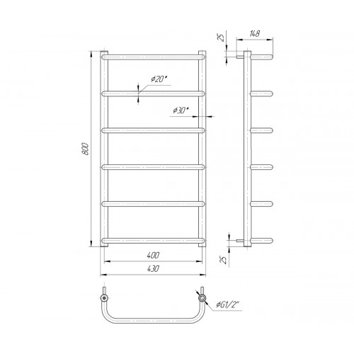Водяной полотенцесушитель Стандарт HP 800х400 с межосевым растоянием для подключения 400мм, диметр подключения G 1/2'' состоит из 6 ребер. Полотенцесушитель Стандарт HP производсветнного предприятия Mario изготовлен из нержавеющей стали АІSI 304 может быть оборудован электрическим теном.