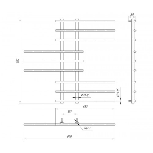 Данная модель полотенцесушителя водяного типа Симфония 900x970/160 отличается внешним дизайном от многих классических моделей благодаря конструктивным особенностям ребер изделия. Горизонтальные накладные перемычки расположены равномерно по три ребра справа и слева от вертикальных центральных осей. За счет такой конструкции использование полотенцесушителя Симфония 900x970/160 становится более практичным и функциональным. Выполнена данная модель из нержавеющей европейской стали AISI 304, высота изделия 900 мм, ширина – 970 мм, а расстояние для подключения м