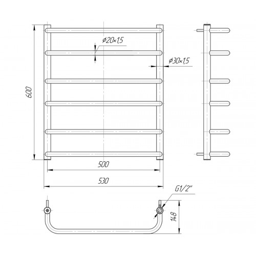 Водяной полотенцесушитель Стандарт 600х500 с межосевым растоянием для подключения 500мм, диметр подключения G 1/2'' состоит из 6 ребер. Полотенцесушитель Стандарт производсветнного предприятия Mario изготовлен из нержавеющей стали АІSI 304 может быть оборудован электрическим теном.