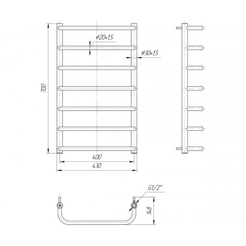 Водяной полотенцесушитель Стандарт 700х400 с межосевым растоянием для подключения 400мм, диметр подключения G 1/2'' состоит из 7 ребер. Полотенцесушитель Стандарт производсветнного предприятия Mario изготовлен из нержавеющей стали АІSI 304 может быть оборудован электрическим теном.