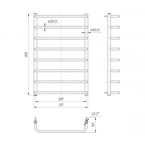 Водяной полотенцесушитель Стандарт 800х500 с межосевым растоянием для подключения 500мм, диметр подключения G 1/2'' состоит из 8 ребер. Полотенцесушитель Стандарт производсветнного предприятия Mario изготовлен из нержавеющей стали АІSI 304 может быть оборудован электрическим теном.