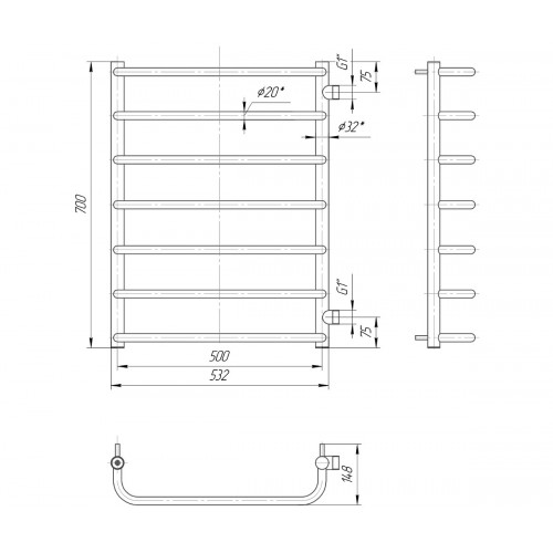 Водяной полотенцесушитель Стандарт Б/П 1" 700х500 с межосевым растоянием для подключения 600мм, диметр подключения G 1'' состоит из 6 ребер. Полотенцесушитель Стандарт Б/П 1" производсветнного предприятия Mario изготовлен из нержавеющей стали АІSI 304.