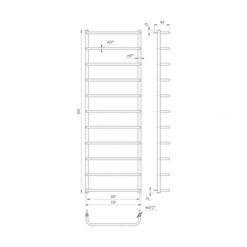 Водяной полотенцесушитель Стандарт HP 1550х500 с межосевым растоянием для подключения 500мм, диметр подключения G 1/2'' состоит из 11 ребер. Полотенцесушитель Стандарт HP производсветнного предприятия Mario изготовлен из нержавеющей стали АІSI 304 может быть оборудован электрическим теном.