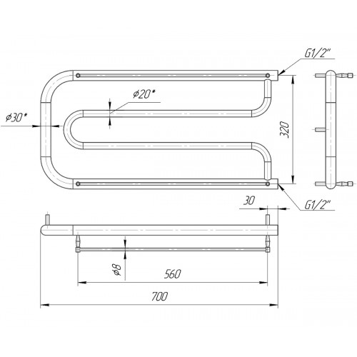 Водяной полотенцесушитель Фокстрот 320х700 с межосевым растоянием для подключения 320мм, диметр подключения G 1/2'' состоит из 1 гиб ребер. Полотенцесушитель Фокстрот производсветнного предприятия Mario изготовлен из нержавеющей стали АІSI 304 может быть оборудован W электрическим теном.