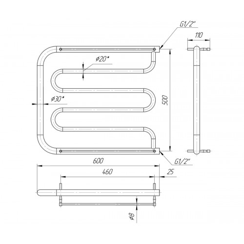 Водяной полотенцесушитель Фокстрот 500х600 с межосевым растоянием для подключения 500мм, диметр подключения G 1/2'' состоит из 3 гиба ребер. Полотенцесушитель Фокстрот производсветнного предприятия Mario изготовлен из нержавеющей стали АІSI 304 может быть оборудован W электрическим теном.