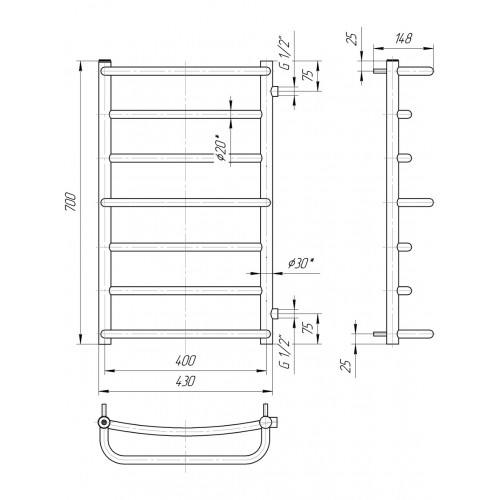 Водяной полотенцесушитель Люкс Б/П 1/2" 700х400 с межосевым растоянием для подключения 600мм, диметр подключения G 1/2'' состоит из 7 ребер. Полотенцесушитель Люкс Б/П 1/2" производсветнного предприятия Mario изготовлен из нержавеющей стали АІSI 304.