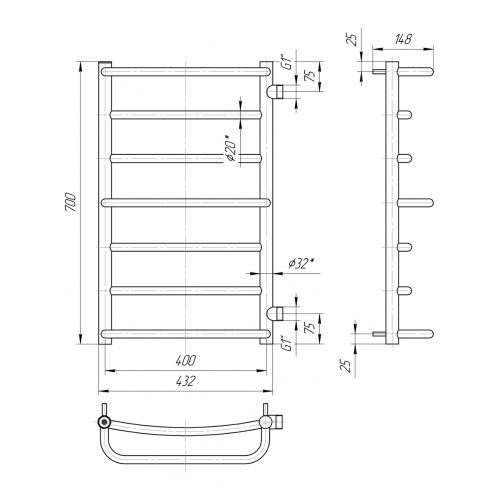 Комплект поставки | полотенцесушитель - 1шт. комплект креплений - 1шт. кран Маевского - 1 шт. заглушка - 1шт. паспорт - 1шт. коробка - 1шт. |