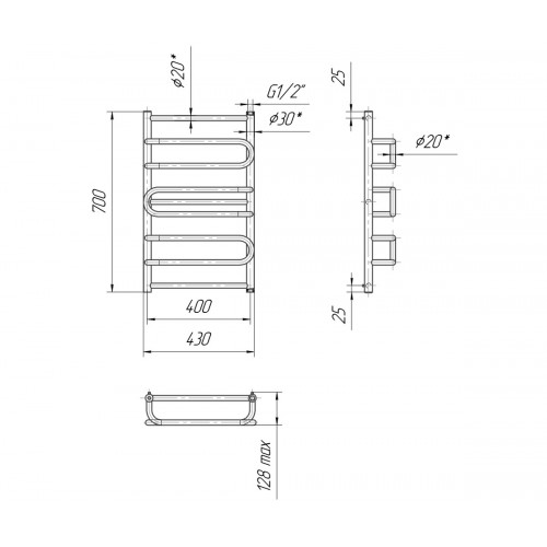 Водяной полотенцесушитель Ница 700х400 с межосевым растоянием для подключения 400мм, диметр подключения G 1/2'' состоит из 5 ребер. Полотенцесушитель Ница производсветнного предприятия Mario изготовлен из нержавеющей стали АІSI 304 может быть оборудован электрическим теном.