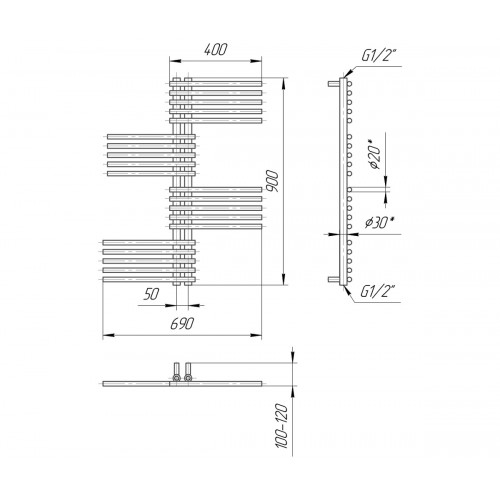 Водяной полотенцесушитель Премиум Симфония 900x690 с межосевым растоянием для подключения 50мм, диметр подключения G 1/2'' состоит из 20 ребер. Полотенцесушитель Премиум Симфония производсветнного предприятия Mario изготовлен из нержавеющей стали АІSI 304 может быть оборудован электрическим теном.