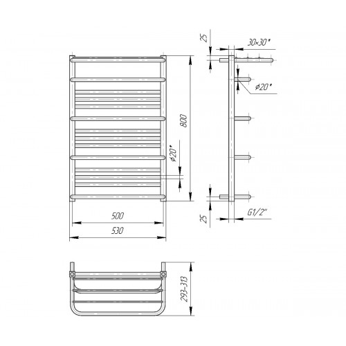 Водяной полотенцесушитель Премиум Люксор 800х500 с межосевым растоянием для подключения 500мм, диметр подключения G 1/2'' состоит из 14 ребер. Полотенцесушитель Премиум Люксор производсветнного предприятия Mario изготовлен из нержавеющей стали АІSI 304 может быть оборудован электрическим теном.