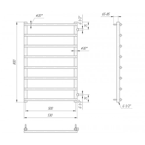 Водяной полотенцесушитель Турин Б/П 1/2" 800х500 с межосевым растоянием для подключения 700мм, диметр подключения G 1/2'' состоит из 8 ребер. Полотенцесушитель Турин Б/П 1/2" производсветнного предприятия Mario изготовлен из нержавеющей стали АІSI 304.