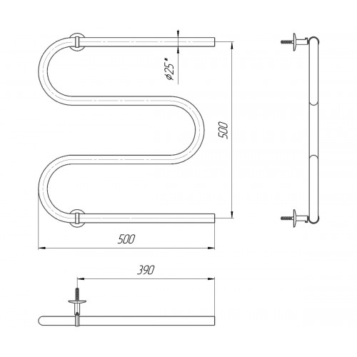 Водяной полотенцесушитель Змейка ∅25 500х500 с межосевым растоянием для подключения 500мм, диметр подключения G 1/2'' 3 гиба. Полотенцесушитель Змейка 25 с боковым подключением производиться на нашем предприятии Марио с 1998 года.