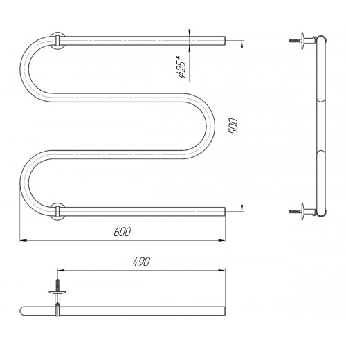 Водяной полотенцесушитель Змейка ∅25 500х600 с межосевым растоянием для подключения 500мм, диметр подключения G 1/2'' 3 гиба. Полотенцесушитель Змейка 25 с боковым подключением производиться на нашем предприятии Марио с 1998 года.