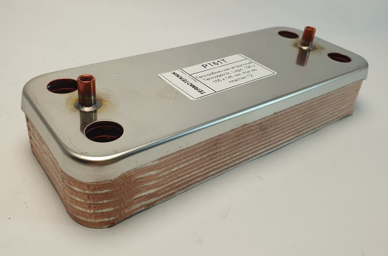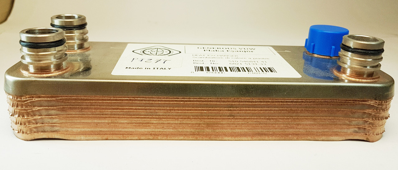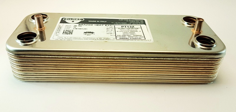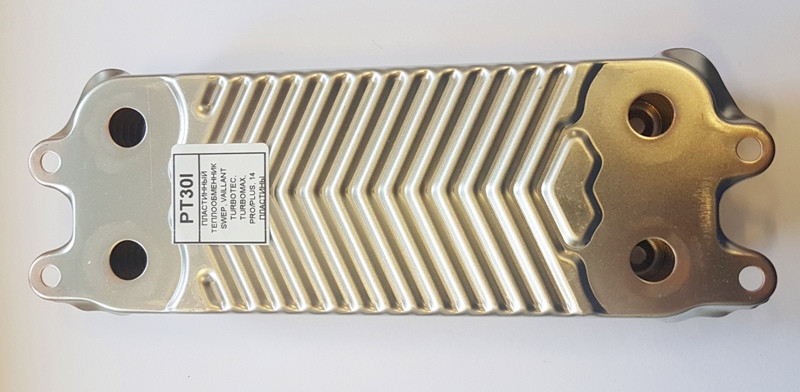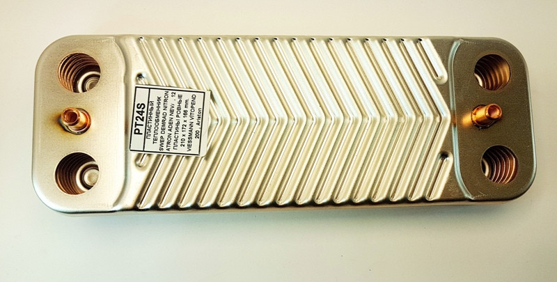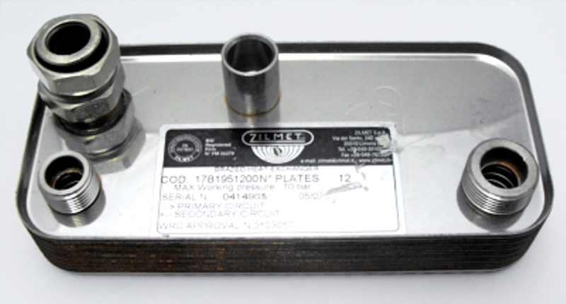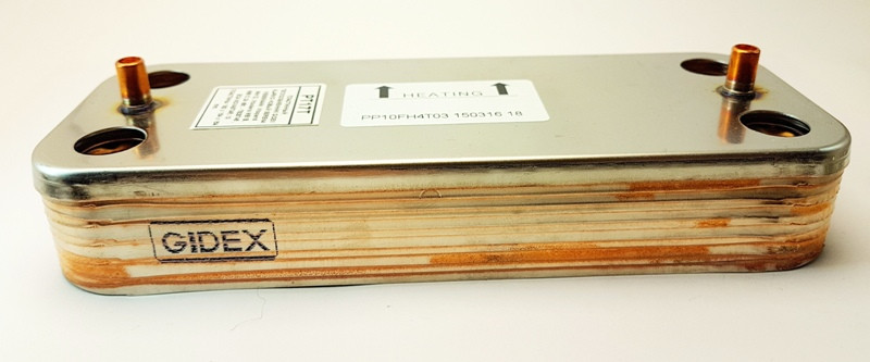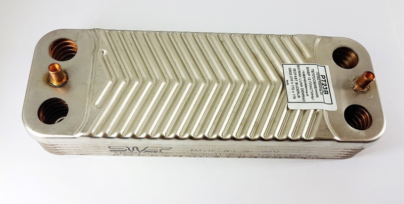 Пластинчатый теплообменник является важнейшим элементом для газового котла. Пластинчатые теплообменники для газовых настенных котлов выполнены из нержавеющей стали. Пластинчатый теплообменник предназначен для нагрева горячей воды в системе ГВС. Нагрев воды в пластинчатом теплообменнике происходит путём нагрева теплообменника теплоносителем из системі отопления. В момент открытия горячей воды, трёхходовой клапан в котле переключает поток теплоносителя на пластинчатый теплообменник системы ГВС и подогревает его.