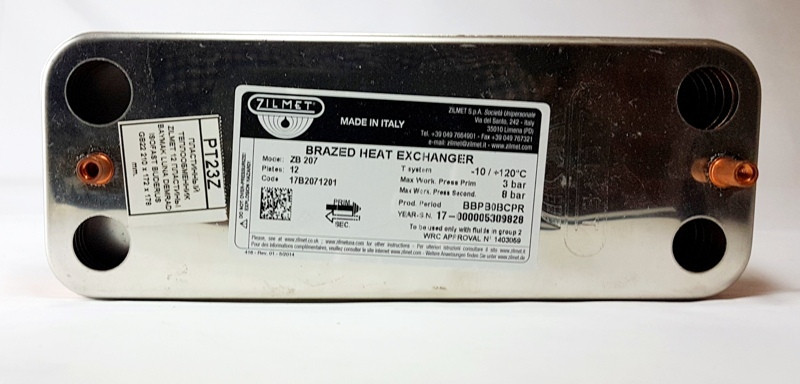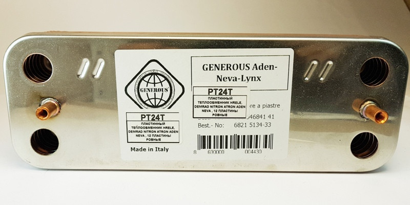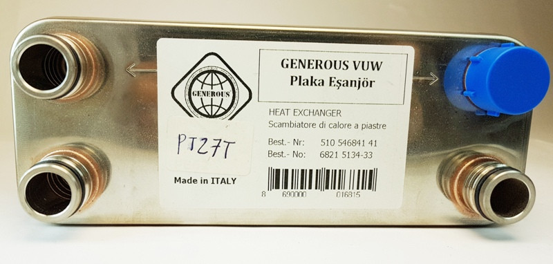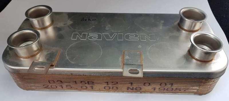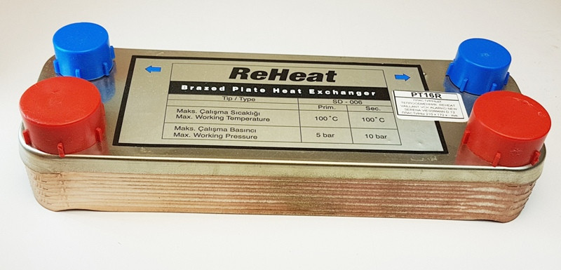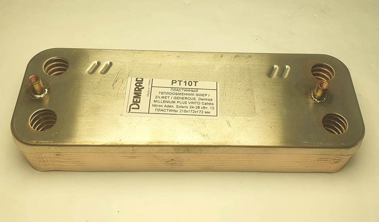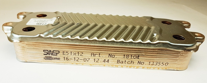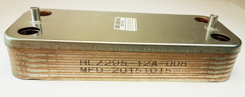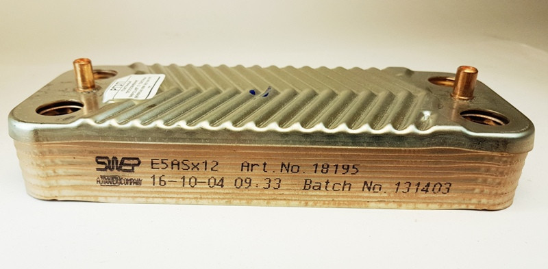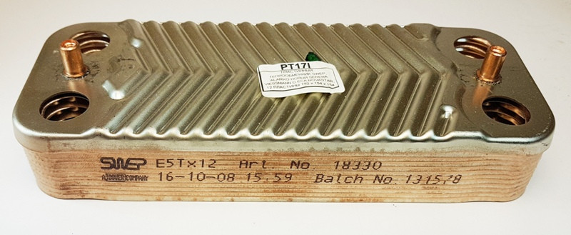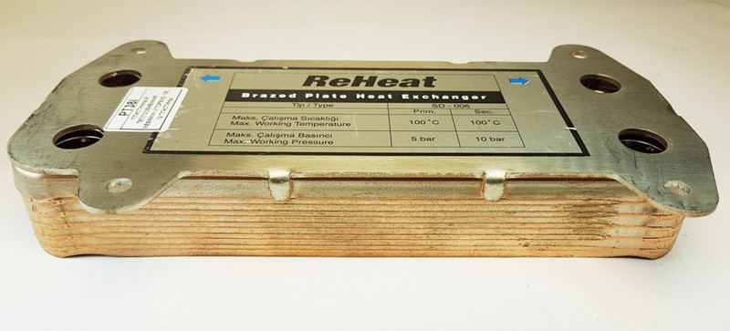 Пластинчатый теплообменник является важнейшим элементом для газового котла. Пластинчатые теплообменники для газовых настенных котлов выполнены из нержавеющей стали. Пластинчатый теплообменник предназначен для нагрева горячей воды в системе ГВС. Нагрев воды в пластинчатом теплообменнике происходит путём нагрева теплообменника теплоносителем из системі отопления. В момент открытия горячей воды, трёхходовой клапан в котле переключает поток теплоносителя на пластинчатый теплообменник системы ГВС и подогревает его.
